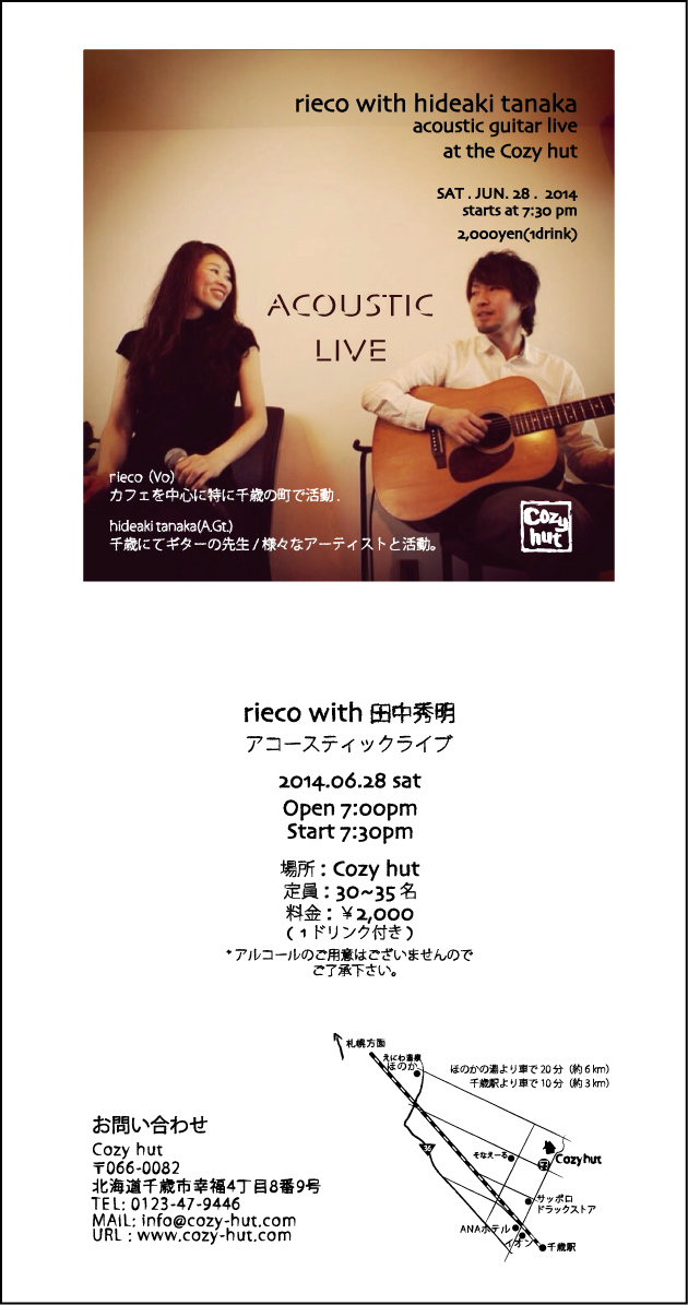 06.28.sat Acoustic Live Posted on 07/06/2014 by cozy hut rieco with hideaki tanaka Acoustic Live at the Cozy hut 千歳のカフェを中心に活動している riecoさん。 ステキなギターの音色の田中秀明さん。 そんなお二人のアコースティックライブが開催決定! カフェに合う音楽。 優しく鳴り響く音。 強く心に響く声。 Cozy hutの大人な夜。 ぜひお越し下さい。 きっと心が温かくなります。。。。。 お席に限りがございますので、 お早めにご予約下さい。