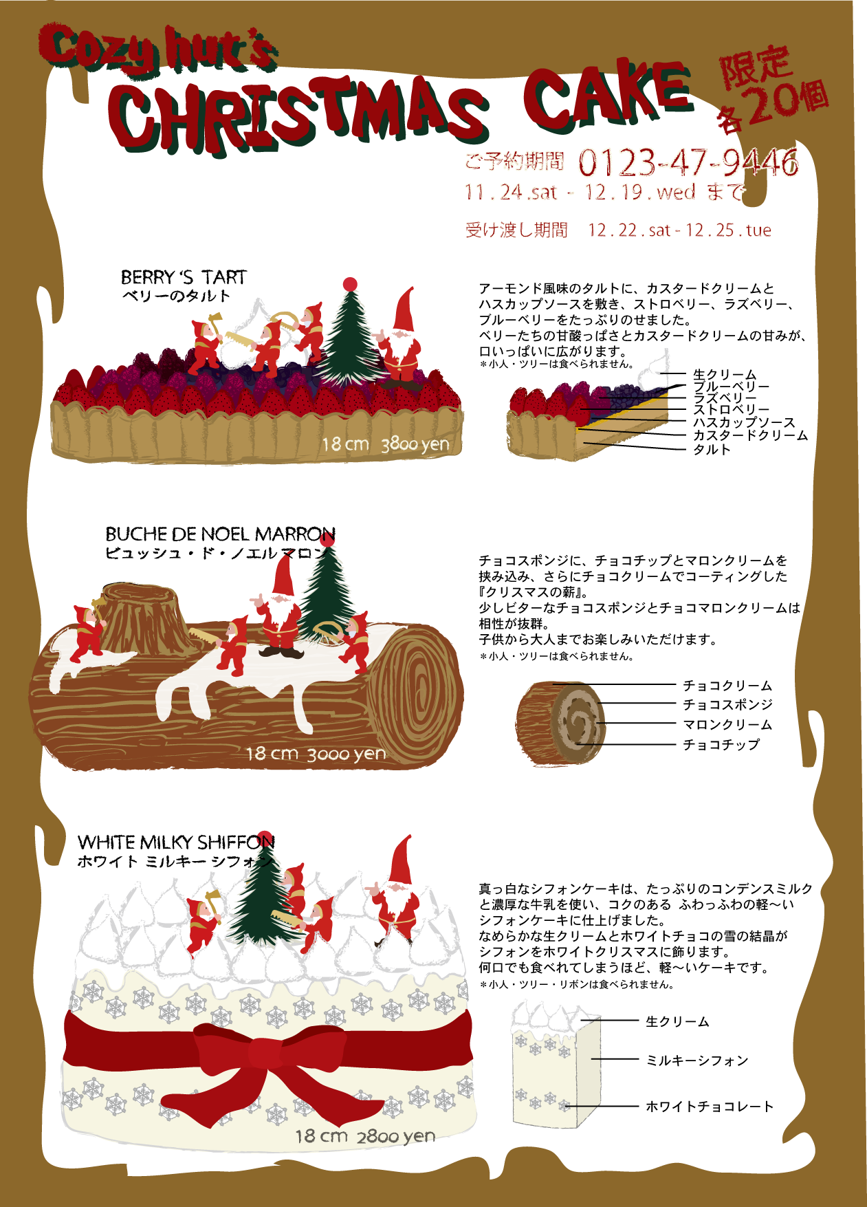 Cozy hut のはじめてのクリスマスは、3種類のクリスマスケーキをご用意しております。