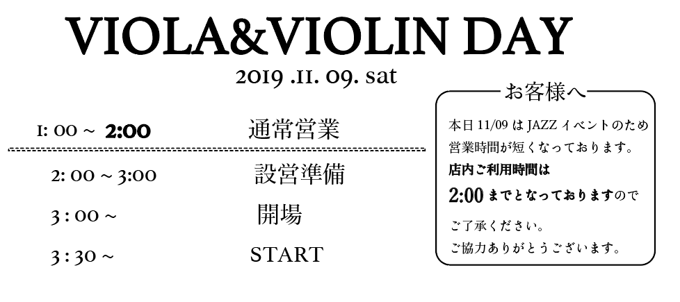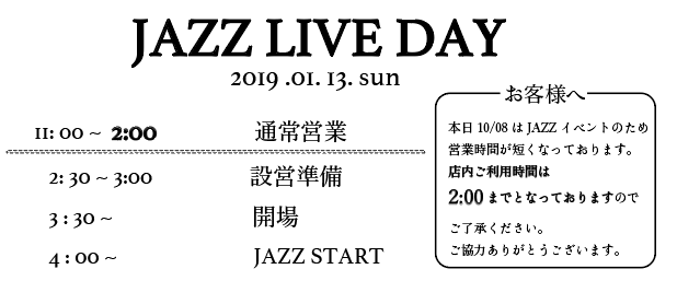 ジャズライブにつき、時間を変更させていただいての営業となります。