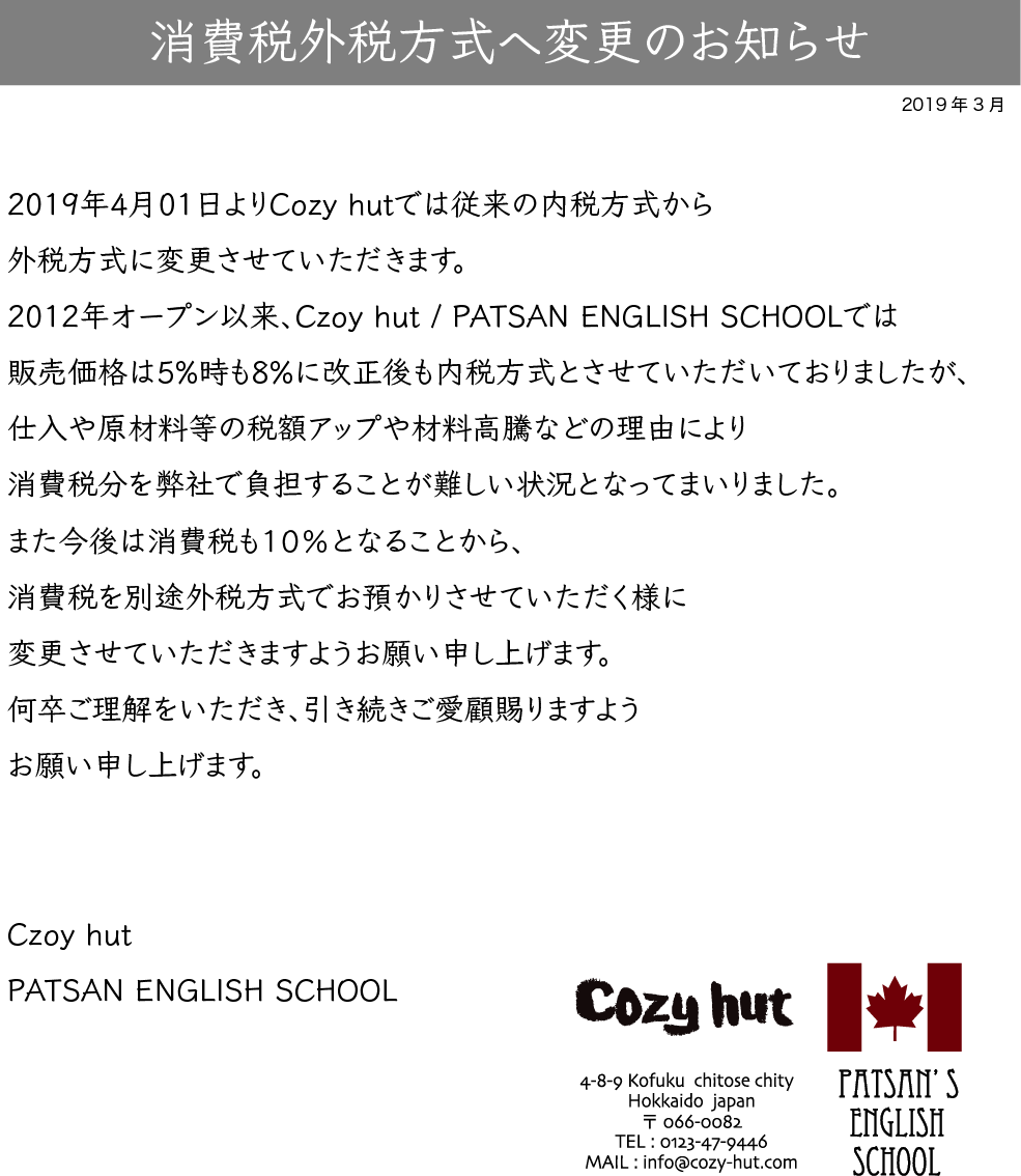 今後ともCozy hutをどうぞよろしくお願いいたします。